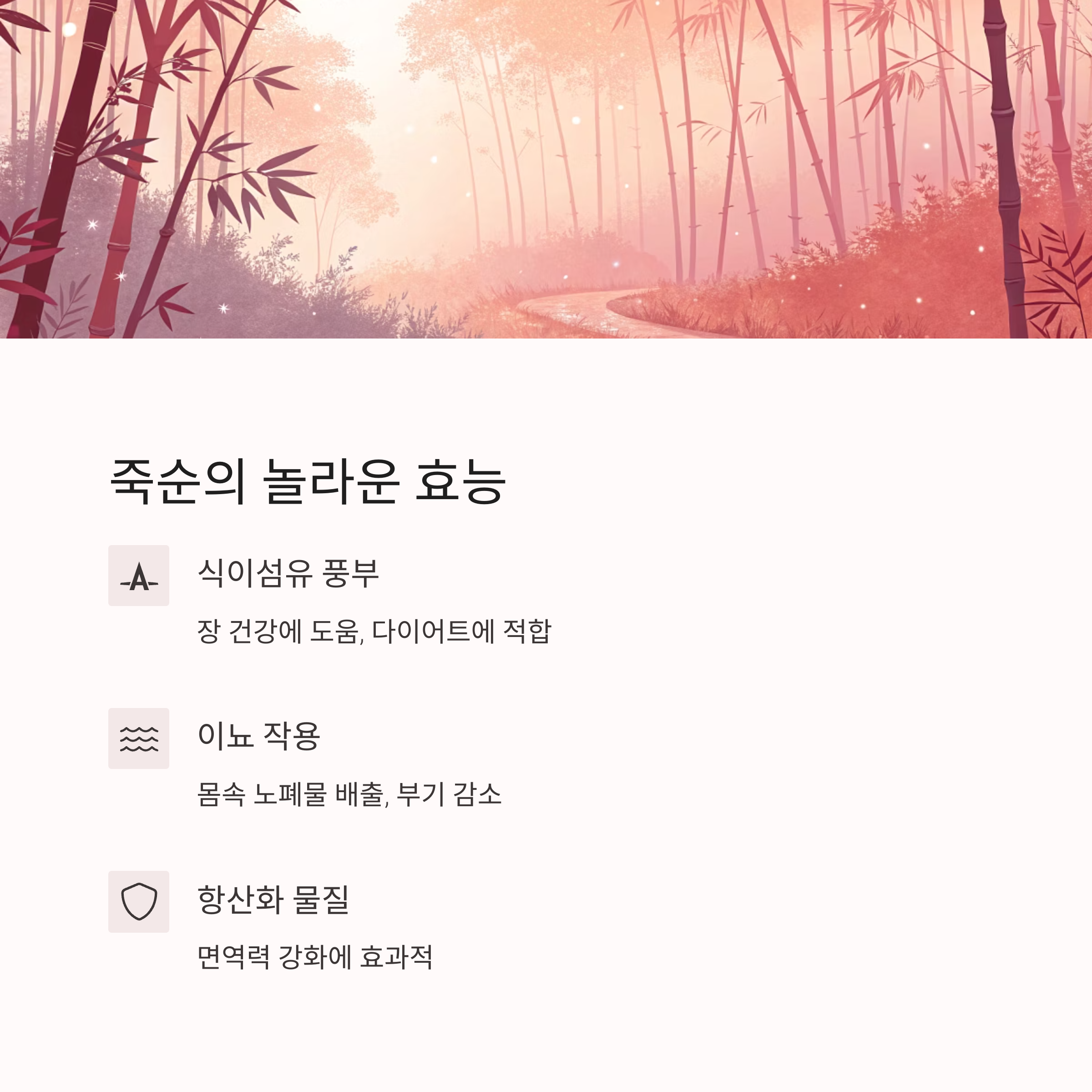 죽순의 대표적인 효능 중 하나는 바로 이뇨 작용이에요. 몸속 노폐물을 배출하는 데 도움이 되고, 부기를 줄이는 데도 좋아요. 또한 항산화 물질이 들어 있어서 면역력 강화에도 이롭다고 알려져 있어요.