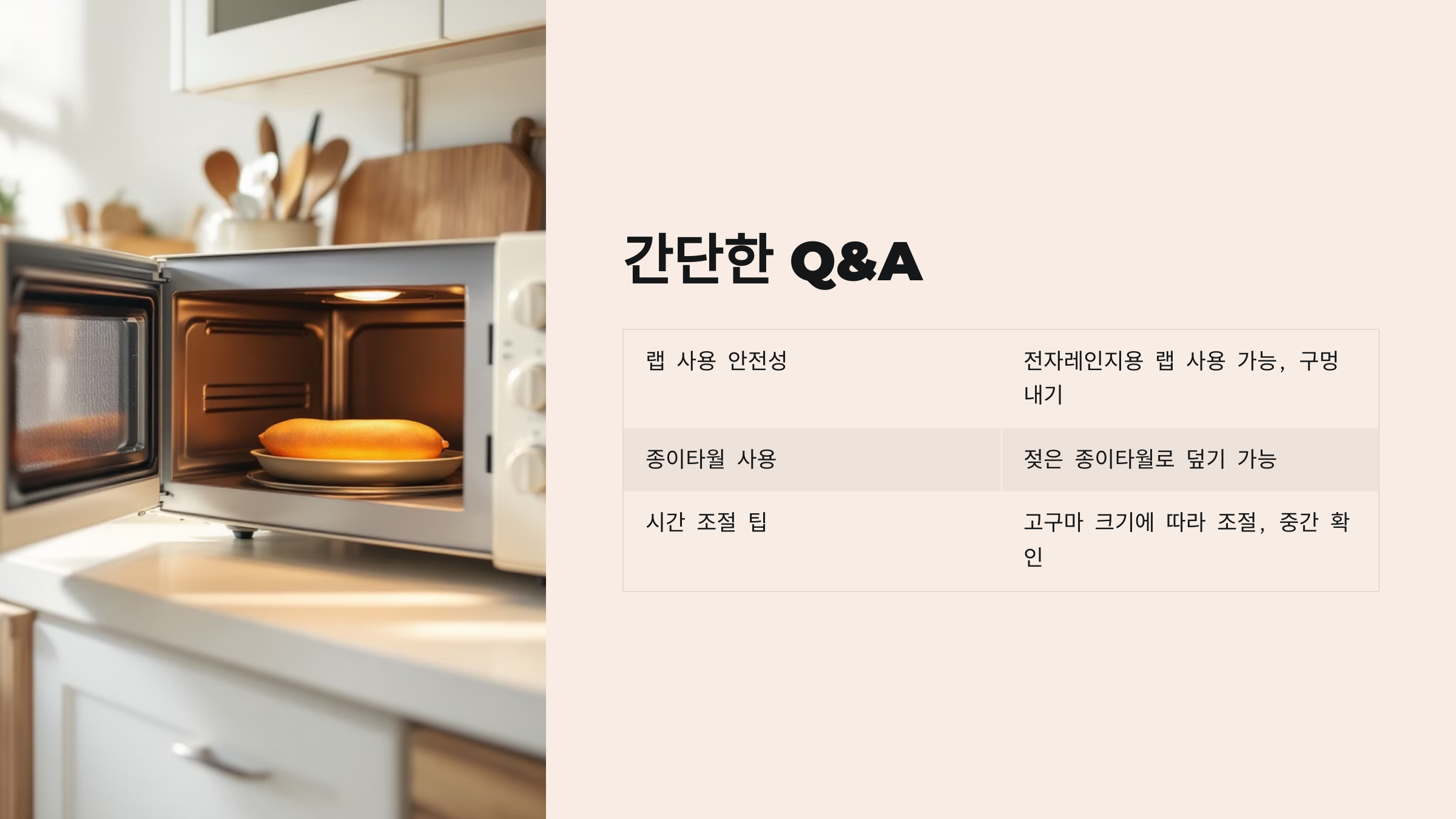A2: 네, 종이타월을 적셔서 사용하면 안전합니다. 젖은 상태로 고구마를 덮어주면 고구마가 촉촉하게 익어 더 부드러운 식감을 즐길 수 있습니다.