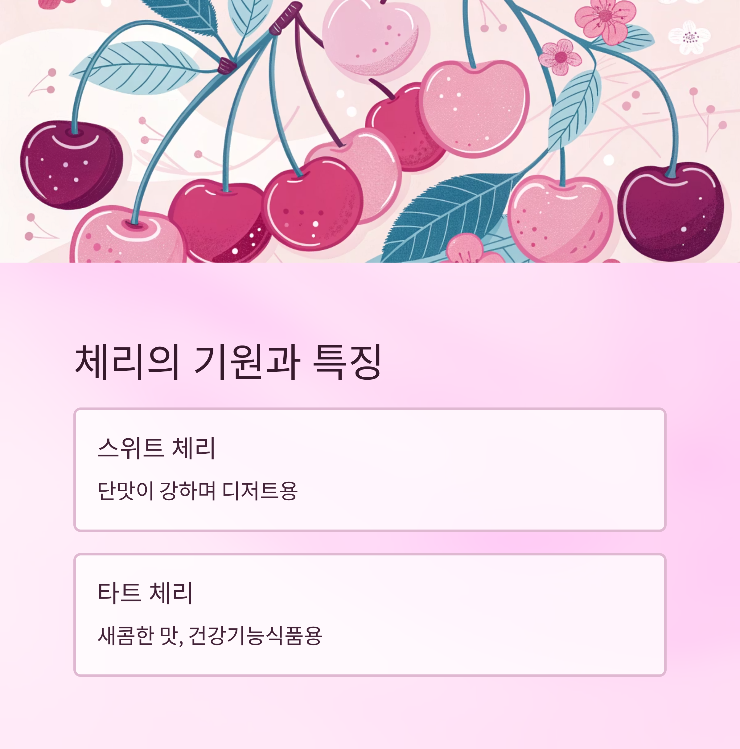 체리는 벚나무속(Prunus) 과일 중 하나로, 유럽과 아시아 지역에서 오랜 역사를 가진 과일이에요. 고대 그리스 시대부터 체리는 재배되었고, 로마 제국을 통해 유럽 전역으로 퍼졌다고 해요. 특히 터키 지역은 세계적인 체리 생산국이기도 하죠.
