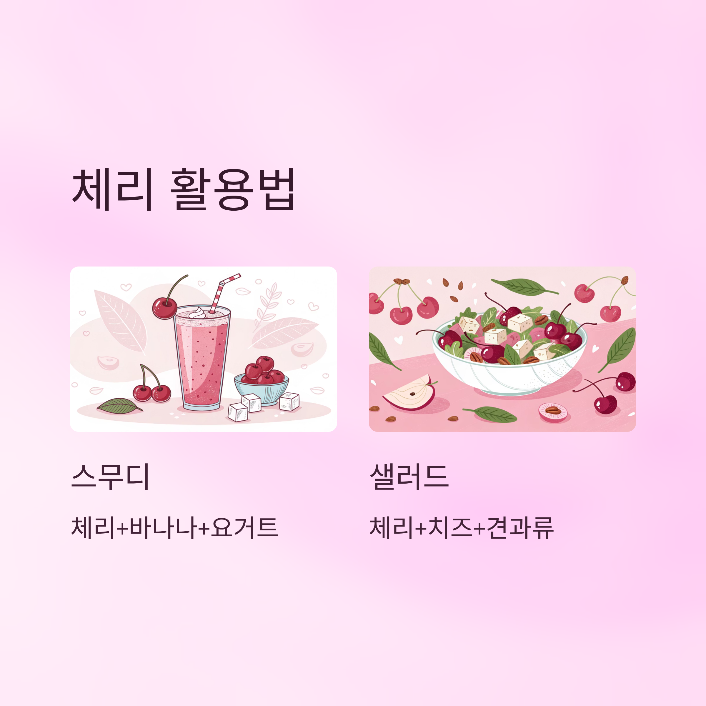 체리를 즐기는 방법은 생각보다 다양해요. 귀찮을 땐 그냥 씻어서 먹고, 여유 있을 땐 스무디나 샐러드로. 어떤 방식이든 체리의 건강 효과는 그대로니까 부담 없이 즐겨보세요 🍒