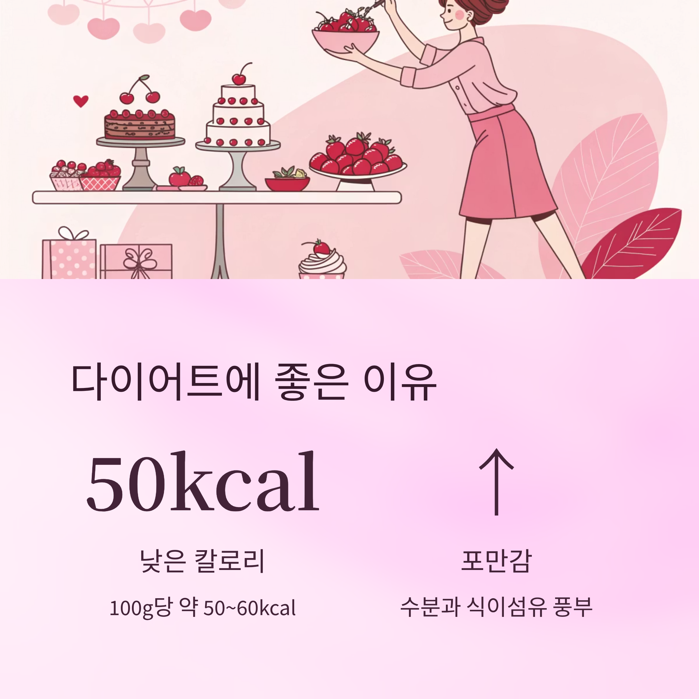 체리는 다이어트를 할 때 추천되는 과일 중 하나예요. 100g당 약 50~60kcal 정도로 비교적 낮은 칼로리를 가지고 있고, 수분과 식이섬유가 풍부해 포만감을 잘 유지시켜줘요. 그래서 과식이나 간식으로 먹기에 부담이 없죠.