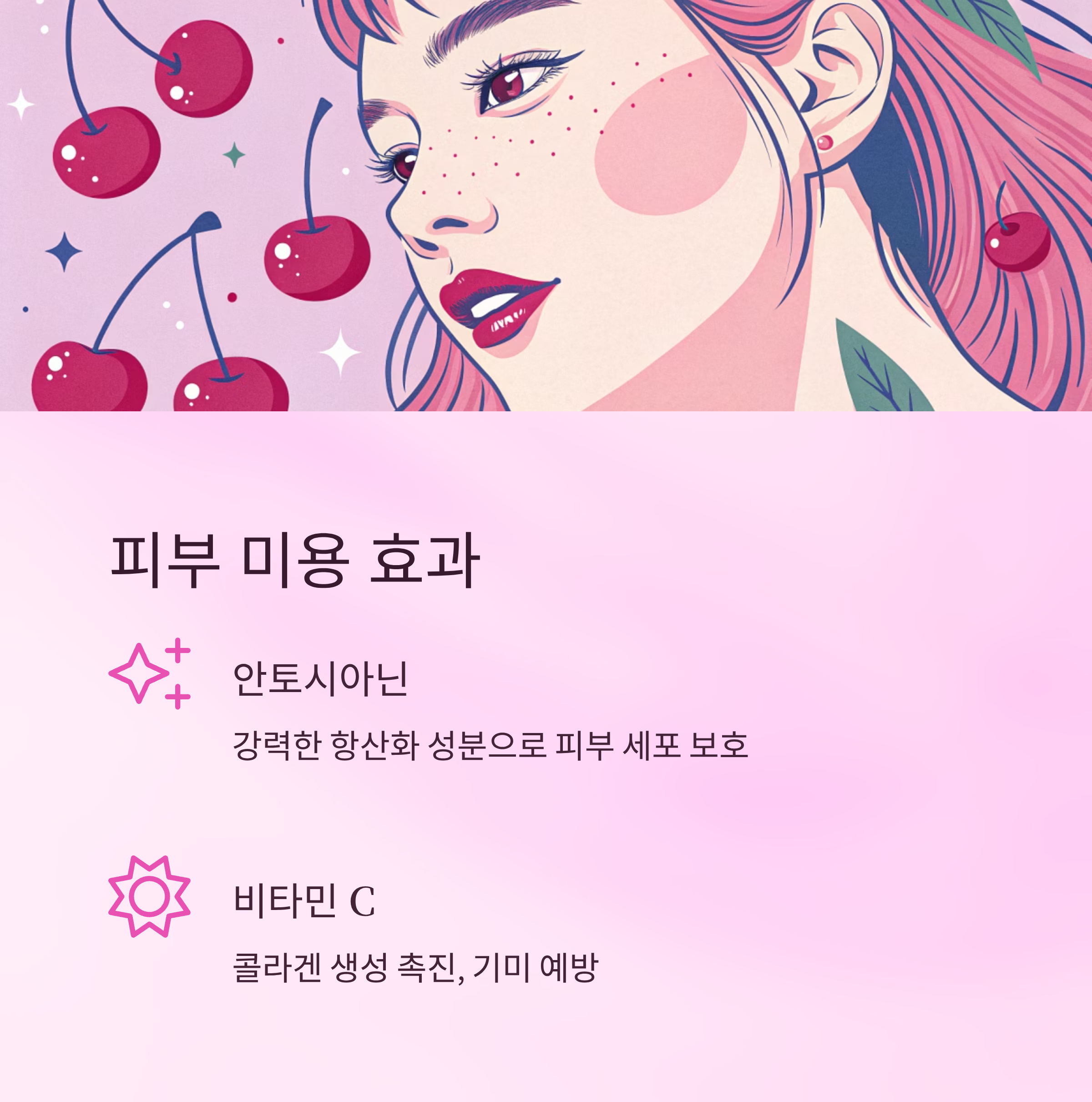 체리는 피부 건강에 탁월한 효능을 보여주는 과일이에요. 특히 안토시아닌과 비타민 C가 풍부하게 들어 있어 피부 탄력을 유지하고 피부톤을 밝게 만드는 데 도움을 줘요. 안토시아닌은 강력한 항산화 성분으로, 피부 세포의 산화를 막아줘요.