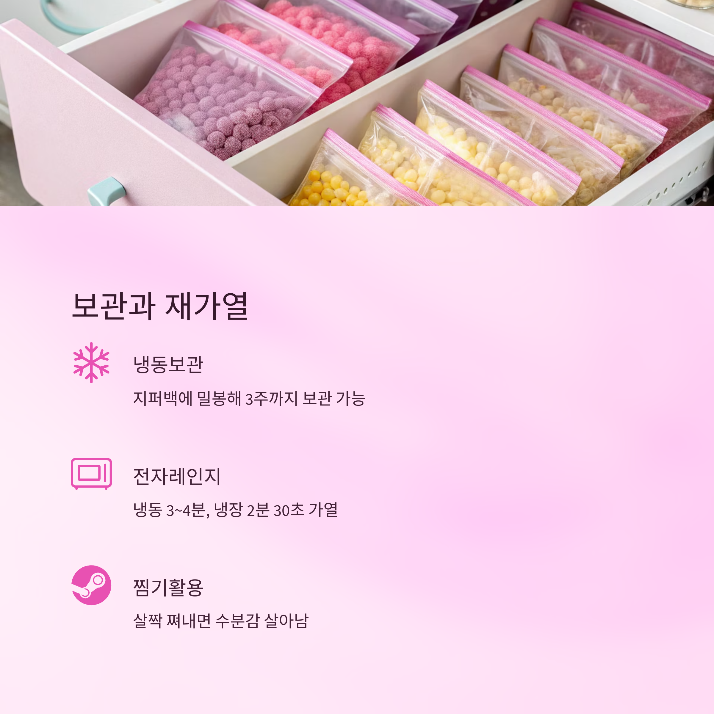또는 찜기에 넣고 살짝 쪄내면 수분감과 식감이 살아나 더욱 맛있게 먹을 수 있어요. 단, 다시 삶는 방식은 추천하지 않아요. 물러지고 풍미가 떨어질 수 있기 때문이에요.