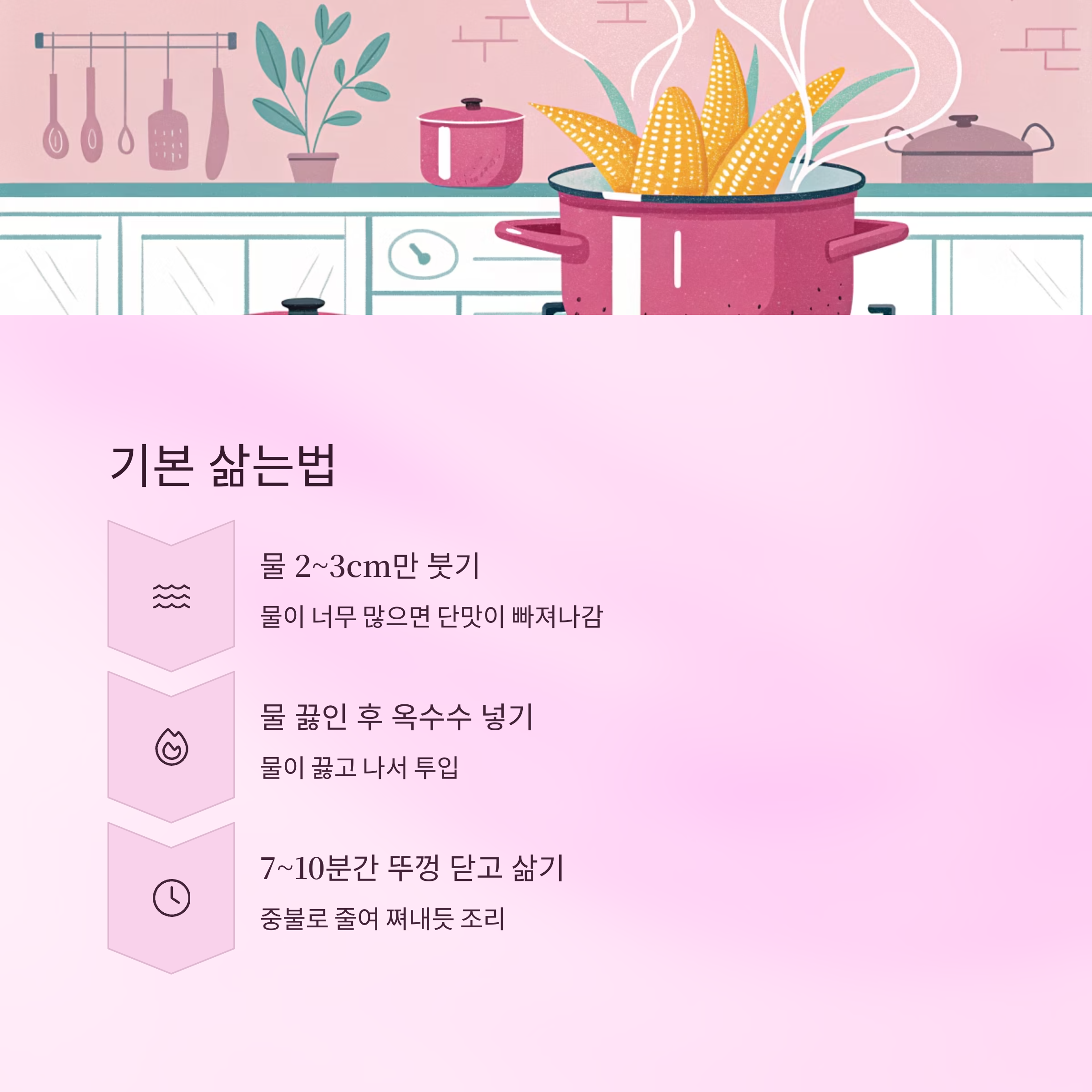 | 초당옥수수 | 높음 | 부드럽고 촉촉 | 짧게 삶기, 전자레인지 |