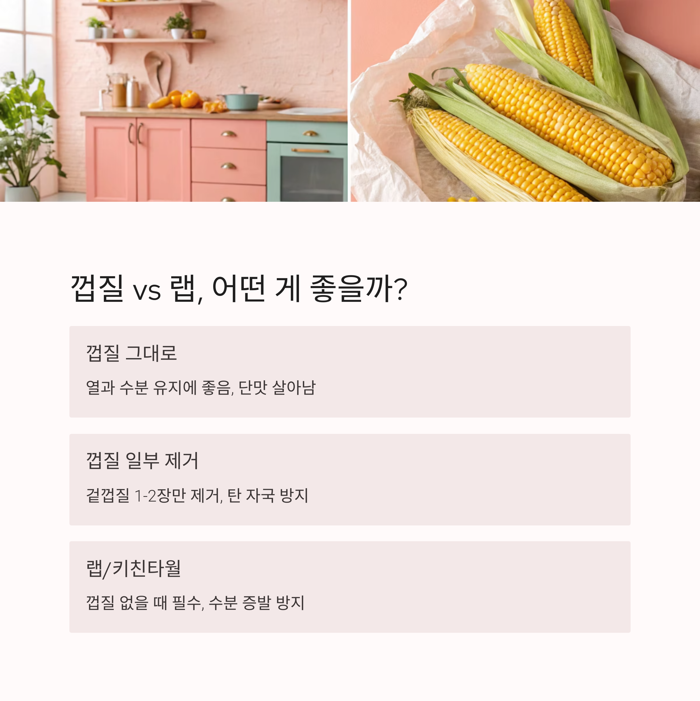 반면, 껍질이 이미 제거된 상태라면 랩이나 키친타월을 활용하는 게 필수예요. 수분이 증발하면서 옥수수가 마르면 특유의 아삭한 식감이 사라지기 때문에 반드시 수분을 가둬줄 장치가 필요하죠.