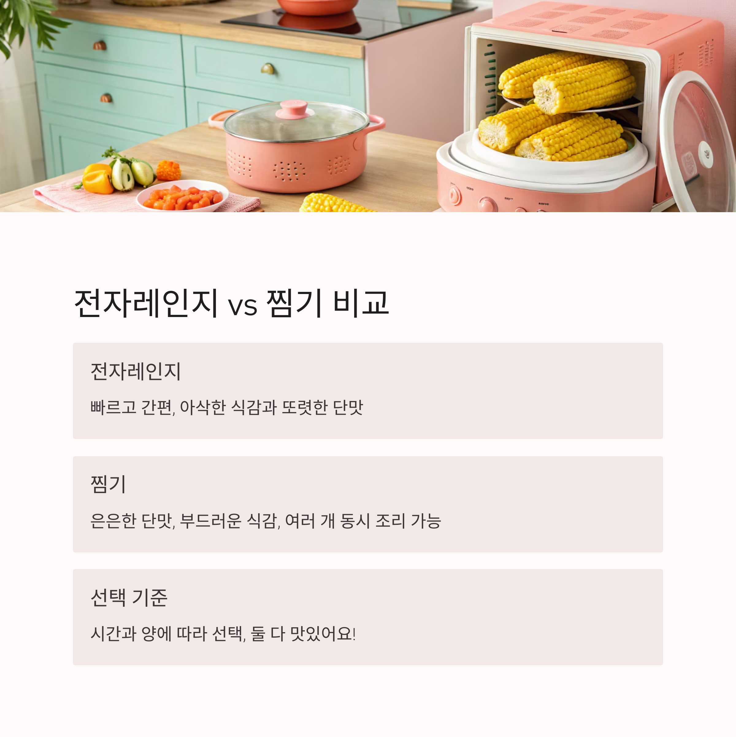 찜기로 찐 초당옥수수는 은은한 단맛이 올라오고 식감이 좀 더 부드러워요. 반면 전자레인지로 찐 옥수수는 아삭함과 단맛이 집중되면서 풍미가 또렷하게 살아나요. 둘 다 맛있지만 취향에 따라 선택할 수 있어요.