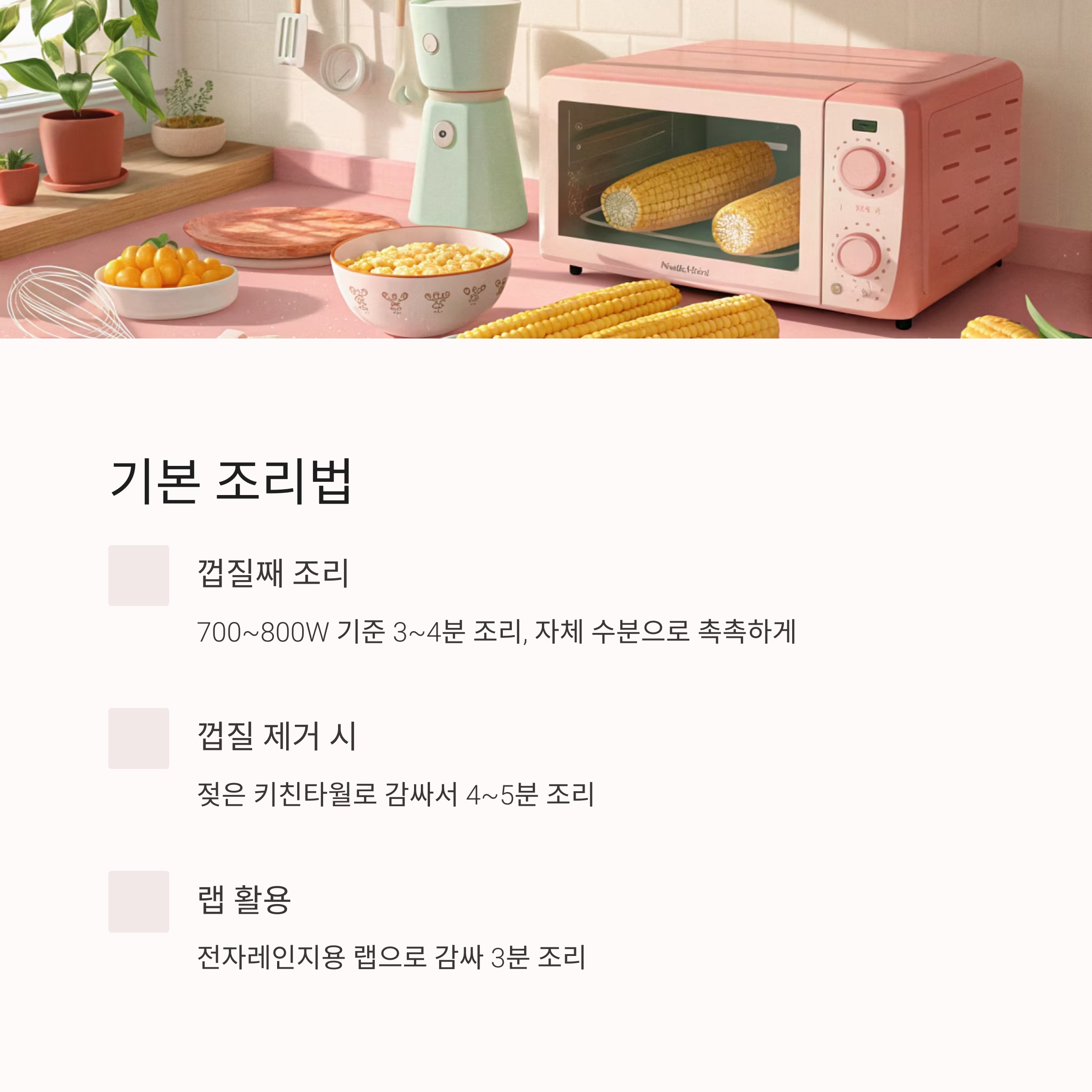 전자레인지로 초당옥수수를 찌는 방법은 아주 간단하지만, 몇 가지 포인트만 잘 지켜주면 맛이 확 달라져요. 가장 기본적인 방식은 껍질째 찌는 거예요. 껍질을 벗기지 않은 채로 물도 없이 전자레인지에 넣으면, 자체 수분으로 촉촉하게 익는답니다.