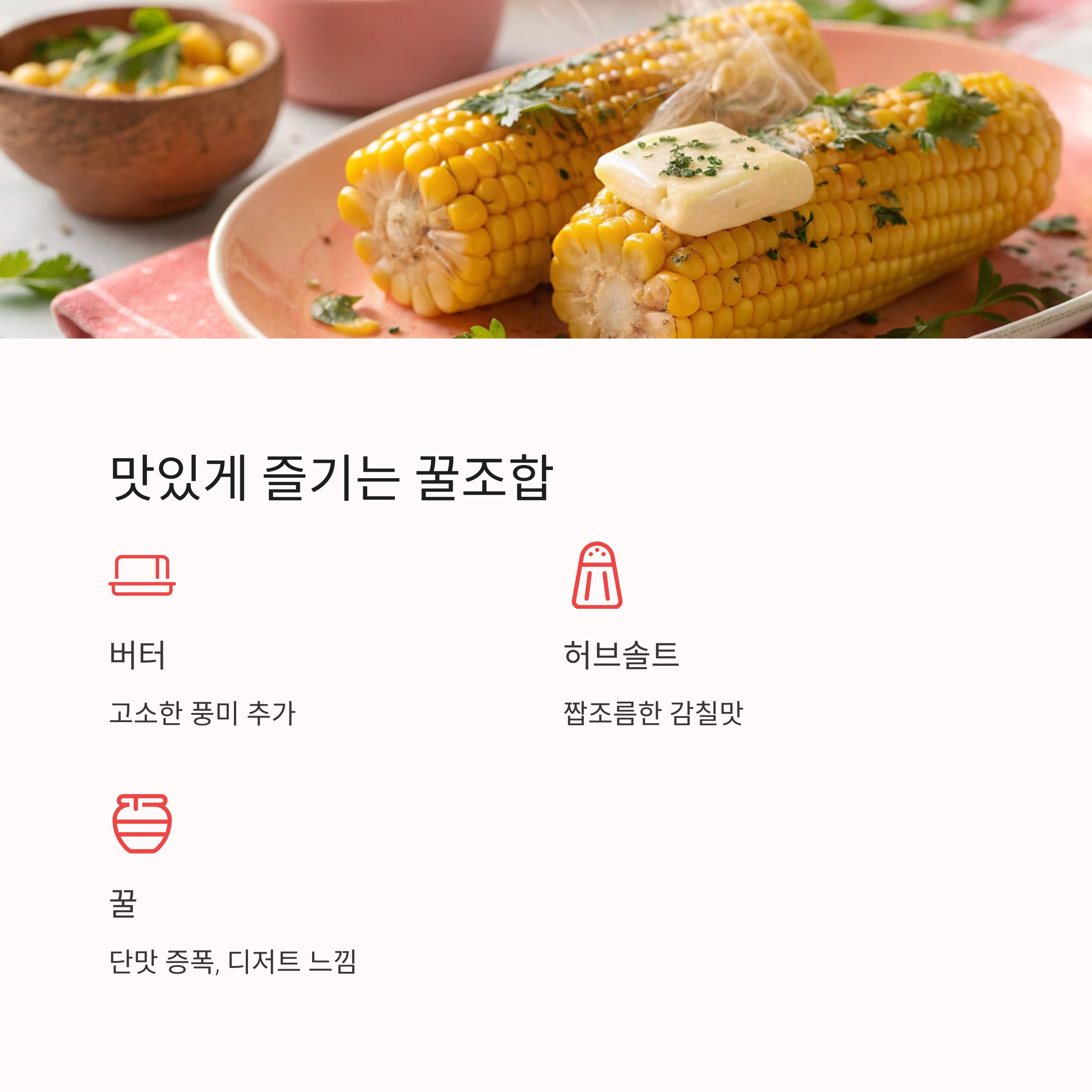 이렇게 다양하게 응용 가능한 초당옥수수! 먹는 재미가 더해지면서 요리 실력도 덩달아 올라간답니다. 🍽️