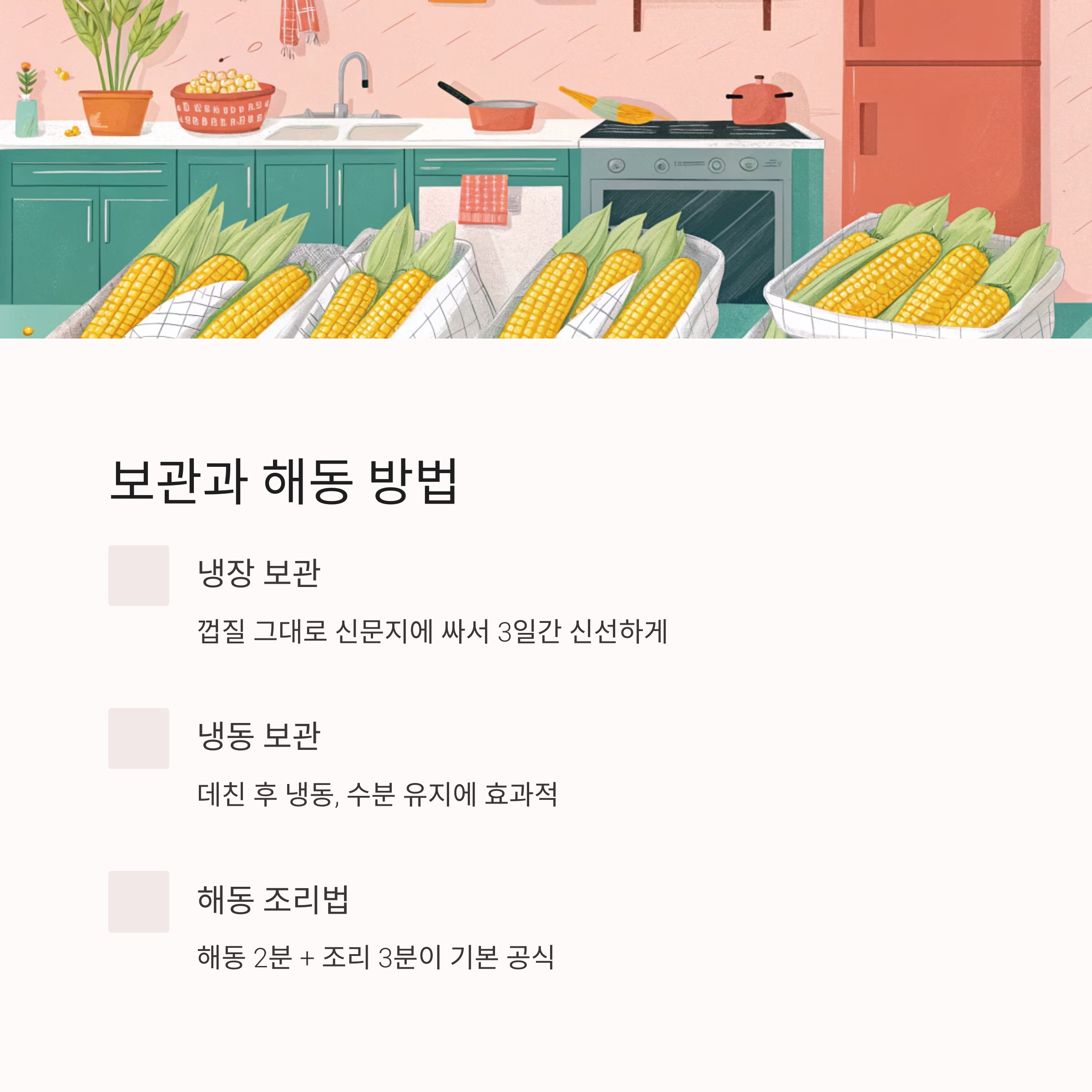 냉동 보관한 옥수수는 자연해동하거나 전자레인지 해동 기능을 활용해 살짝 녹여준 다음, 일반 초당옥수수 찌는 시간보다 1분가량 더 돌려주면 맛있게 익어요. 해동 후 바로 전자레인지에 돌리면 수분이 날아가 퍽퍽해질 수 있으니 조심하세요.