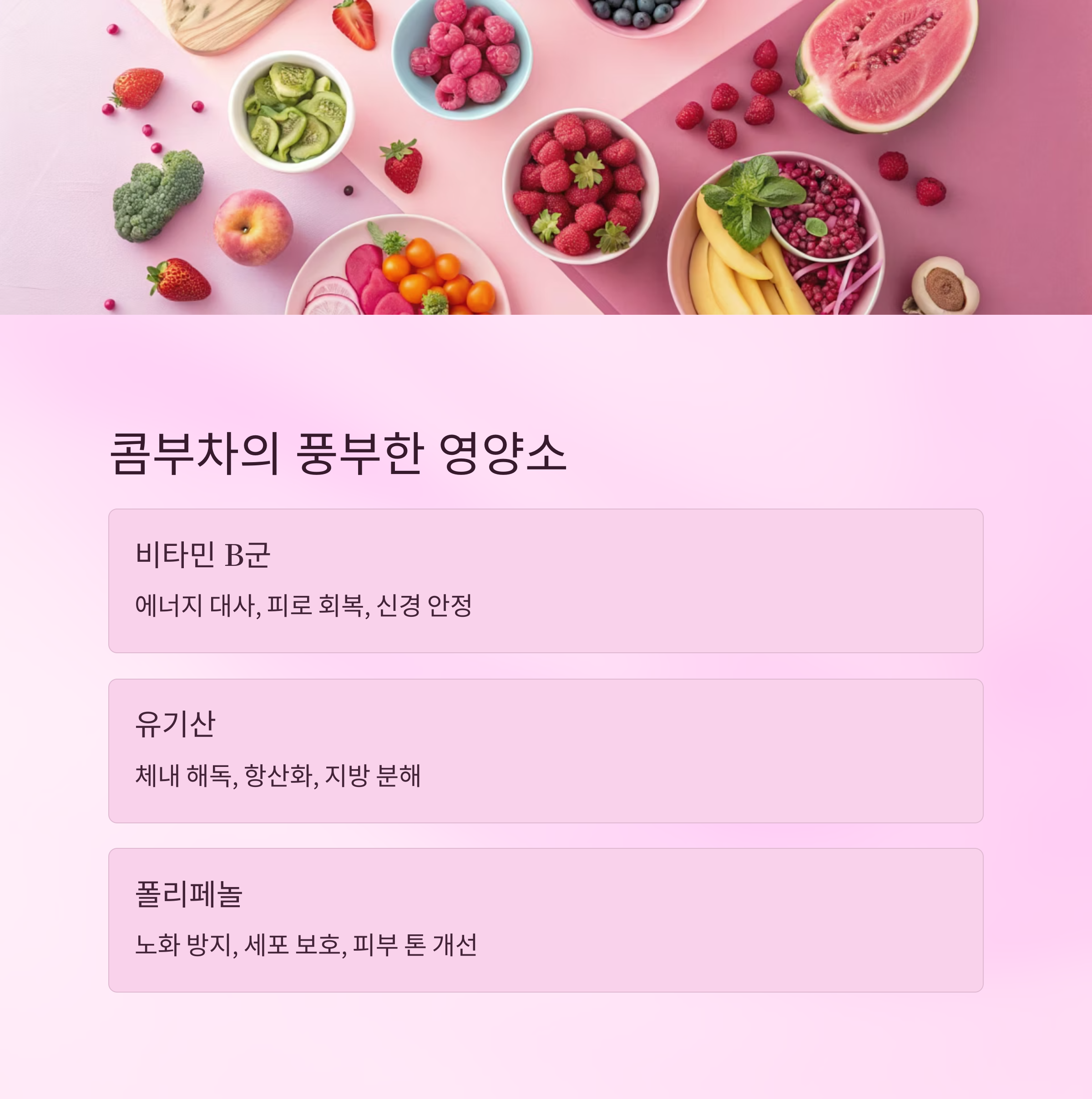 콤부차는 단순한 발효 음료가 아니에요. 다양한 영양소가 포함돼 있어서 마시는 것만으로도 몸에 여러 긍정적인 영향을 줄 수 있답니다.