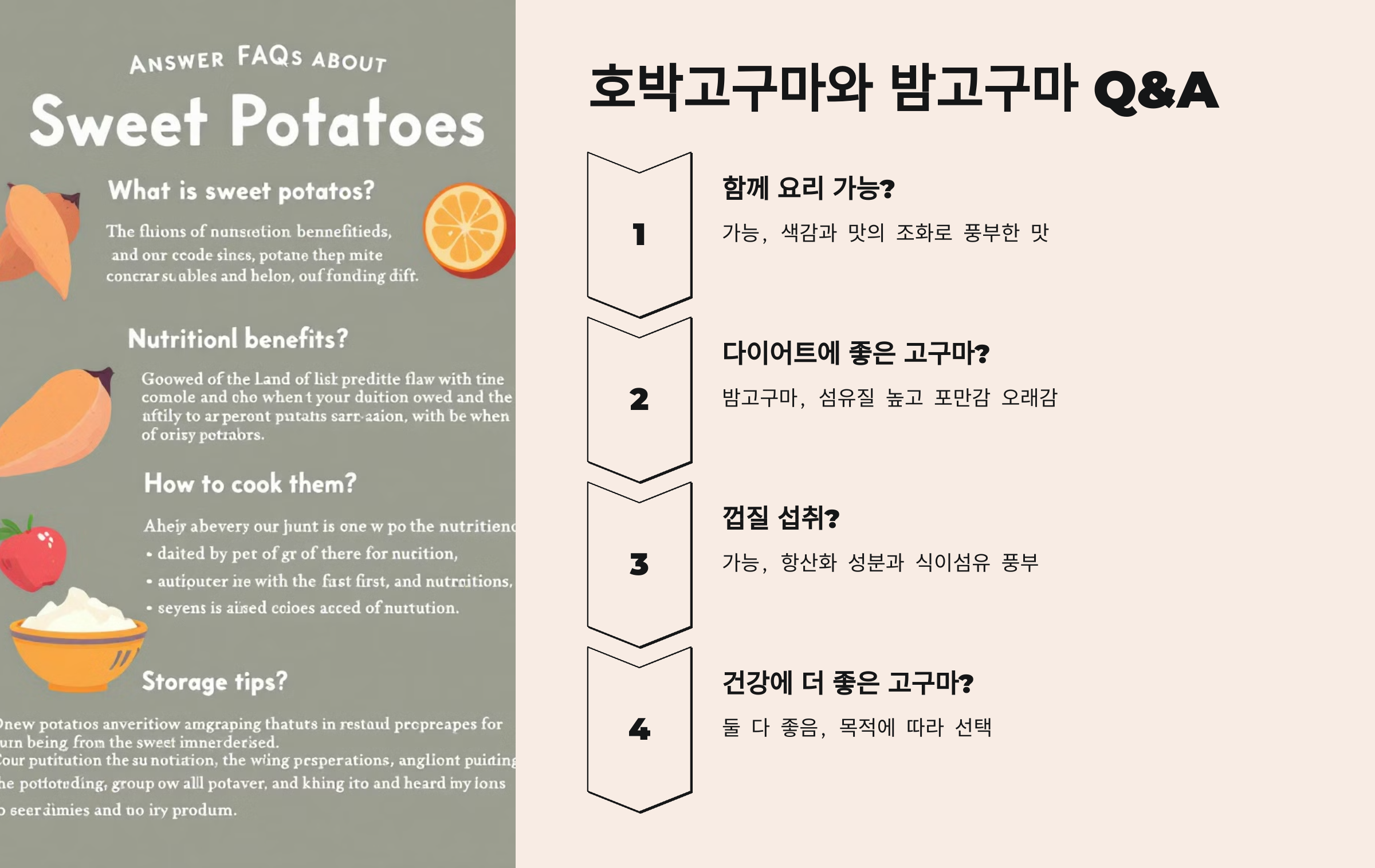 A4: 두 고구마 모두 건강에 좋은 영향을 줍니다. 면역력과 눈 건강을 생각한다면 베타카로틴이 많은 호박고구마, 뼈 건강과 철분 보충을 생각한다면 밤고구마가 더 좋습니다.