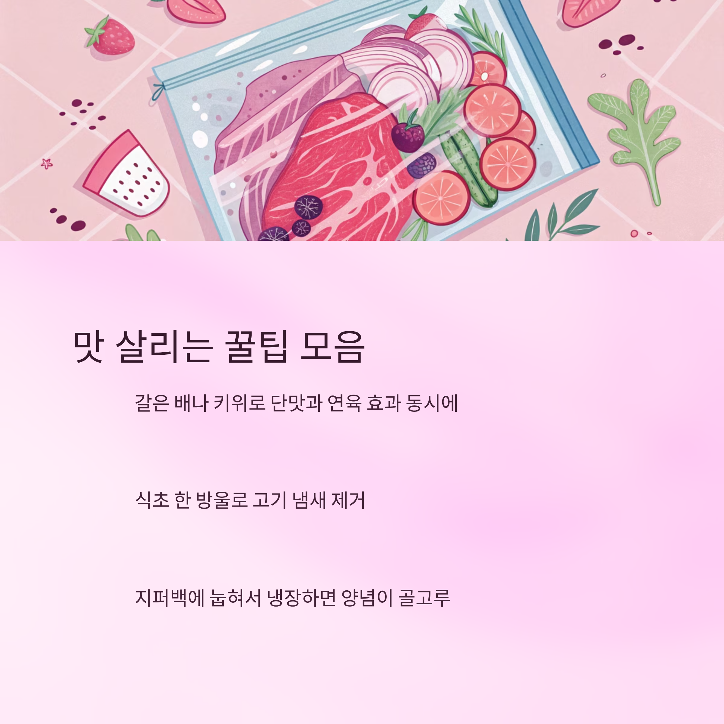 1. 양념할 때 꼭 갈은 배 또는 키위를 넣어주세요. 단맛과 연육 효과를 동시에 얻을 수 있어요. 다만 과일은 오래 숙성하면 고기가 흐물거리니 시간 조절이 핵심이에요.