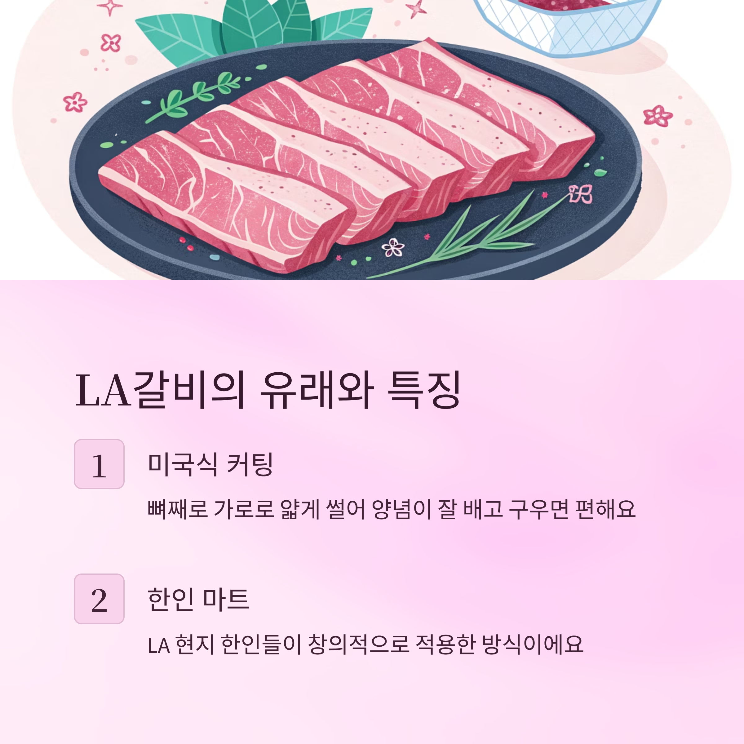 LA갈비는 미국식으로 커팅된 갈비 부위를 말하며, 얇고 넓게 잘라 쉽게 양념이 배고 조리도 간편한 점이 매력이에요. 특히 한국식 양념과 만나면 누구나 좋아할 맛으로 재탄생한답니다. 그래서 명절이나 가족 모임에 빠지지 않는 단골 메뉴이기도 해요.